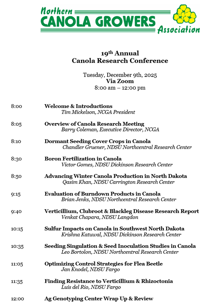 The Northern Canola Growers Association will hold its 19th Annual Canola Research Meeting via Zoom on Tuesday, December 9th beginning at 8:00am. We extend our invitation for you to attend this meeting and share any thoughts or ideas you have concerning canola research important to canola growers.